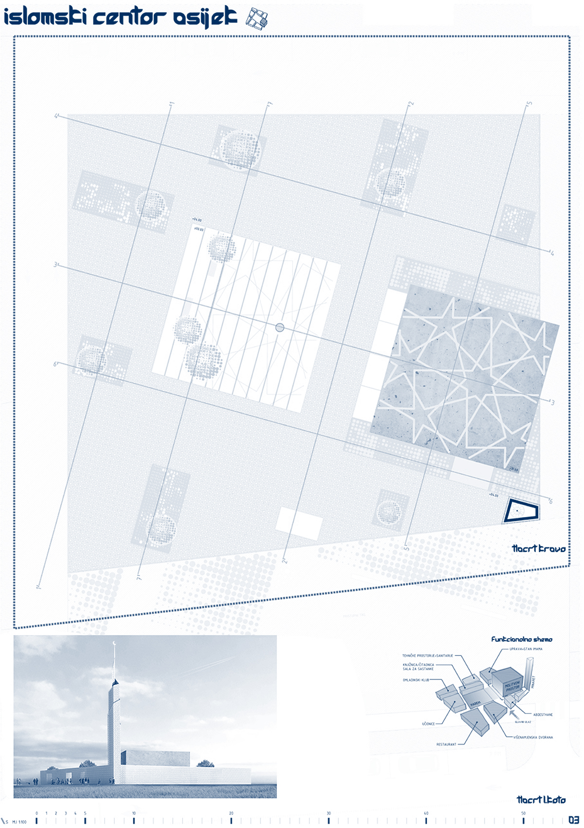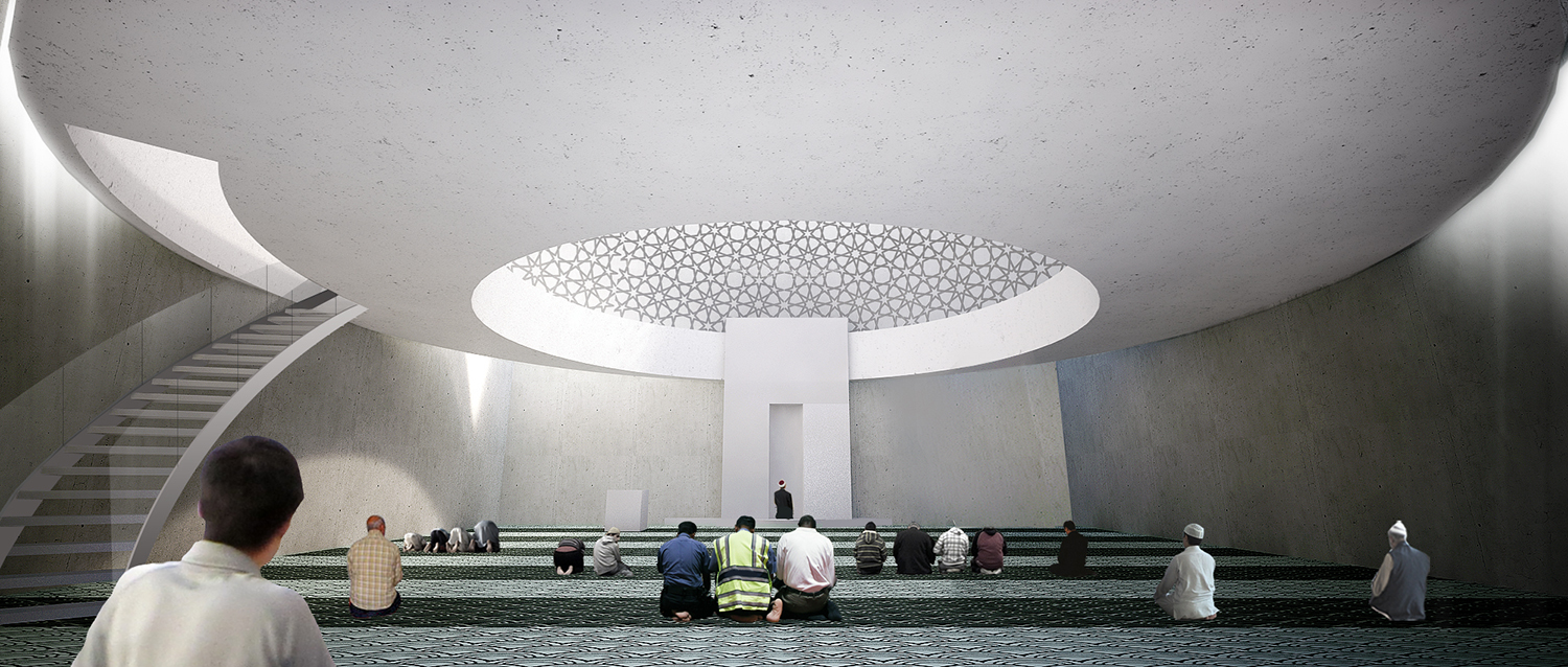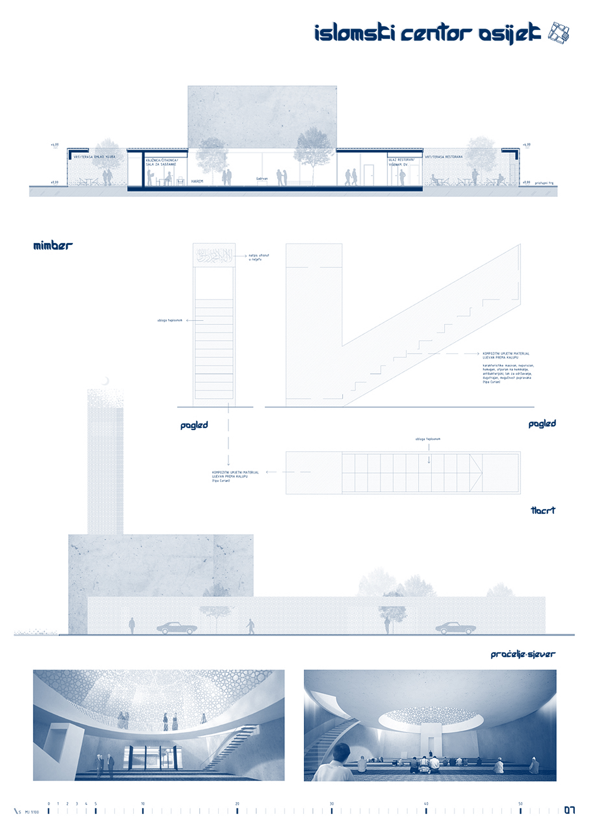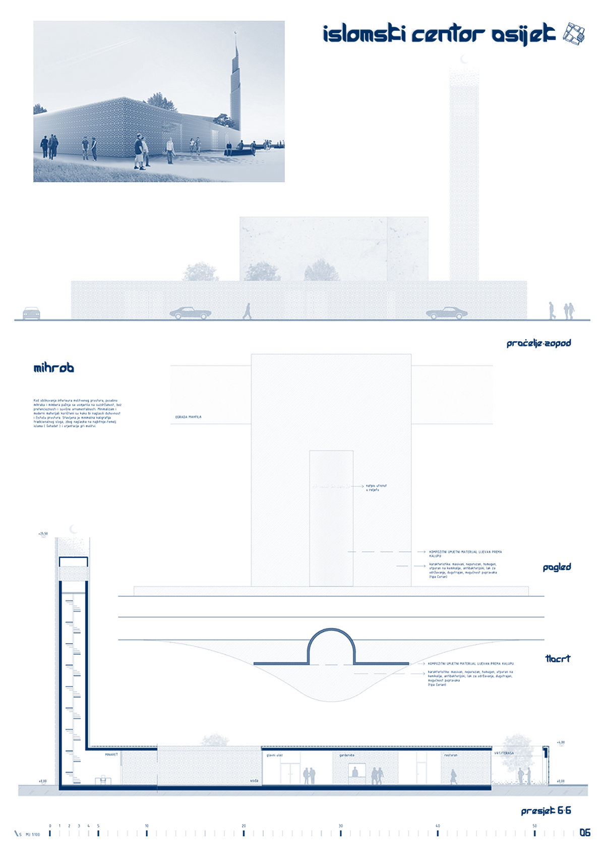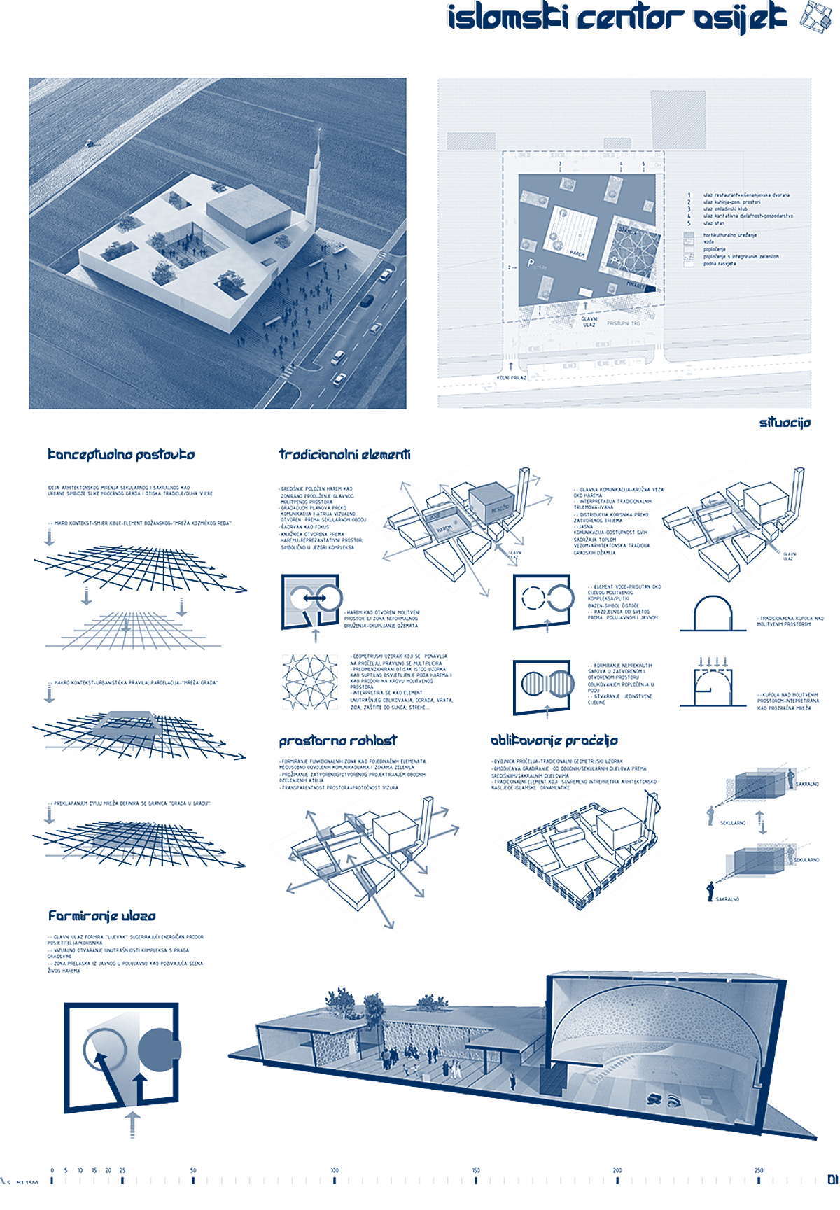 ”Osnovno obilježje i eksplicitni koncept natječajnog rada je rahla matrica onoga što Autor naziva ”gradom u gradu”. Ne radi se o idiosinkratskom imenovanju, nego o referenci na tradiciju arhitektonske tipologije koju je H. Hertzberger nazvao ”kazbahizmom” (još ju se zove ”strukturalizmom”, ”tepih” ili ”mat” arhitekturom), ili riječima Alda van Eycka, u kojoj su ”odnosi među stvarima i unutar stvari važniji nego stvari same”. Praksa koja se najprepoznatljivije očituje u smanjivanju objektnosti zgrade, odnosno raspršivanju, razbijanju volumena u jedinice manje kompaktnosti, na način da plastična forma jednog objekta (kao ”smrznute glazbe”, kao ”igre volumena pod suncem”) gubi na značaju u korist matrice koja povezuje više manjih – samih po sebi besformnih, formalno neutralnih – u urbanu cjelinu. Paradoks: razbijanjem se postiže cjelina. Van Eyckova filozofija: ”Grad je velika kuća, a kuća je mali grad”. Strukturirajući ovu kuću kao mali grad, Autor na kvalitetan način postiže neka od glavnih svojstava traženih projektnim zadatkom: prostornu višeslojnost, strukturiranu umreženost raznorodnih sadržaja, integriranu alternaciju otvorenih i zatvorenih površina, kao i estetsku nepretencioznost u skladu s islamskom etikom skromnosti i duhovnosti. Do jednog od bitnih raslojavanja u povijesti moderne arhitekture došlo je upravo otuda što je Team X (na čelu s van Eyckom i Smithsonima) zahtijevao reviziju principa disocijacije i segregacije kakvu je proizvodio klasični modernizam, prema arhitekturi integriranja, umreživanja, asocijacije. Radi se u krajnjoj konzekvenci o novoj definiciji suštine arhitekture: ona, kažu, ne prebiva u smrznutom akordu pozitivnog volumena, na čije ćemo se skulpturalne estetske kvalitete nezdravo fiksirati (diviti se, sagledavati, pljeskati, fotografirati) nego u prostoru između zidova – negativnom volumenu. Traže se ”primjeri koji sprečavaju izgrađene elemente od dominiranja, u korist prostora između” (Hertzberger). Genijalan zaokret: događanje umjesto sagledavanja! Što treba projektirati: ne formu objekta već formu ljudskog prostornog postojanja koju objekt generira. U epohi obilježenoj kao ”društvo spektakla”, društvo anestetizirane potrošnje senzacija, artikala i imidžâ, s pritiskom neprestanog kreiranja/dizajniranja novih i novih potrošnih formi, između ostaloga simulakrumskih kuća-slikâ, Autor se priklanja stavu po kojem ništa nije primjerenije kao arhitektura kompleksa sakralne provenijencije – po svojoj naravi antagonističke epohi – od tipologije koja negira ekspresivnu plastiku i uopće fiksaciju na volumetriju. Primjenjujući, umjesto produkcije sljedećeg u nizu hirova dizajna, smithsonovski postulat po kojem elementi istog reda ne trebaju izgledati različito bez razloga – nota bene, također prisutan u islamskoj estetici repetitivnosti i multiplikacije. Čak i kupolu i minaret oblikujući usuprot logici ikoničkog spektakla, aplicirajući i na njih elementarni kubusni minimalizam primijenjen na bazi. Upravo taj minaret i kupola (odnosno, jezgra sačinjena od molitvenog prostora i harema, tlocrtno identičnih, volumenski oprečnih) predstavljaju dosljedno provođenje i sljedećeg postulata strukturalističke arhitekture: supostavljanja, po Autoru, ”dva određujuća elementa građevine”: neutralnu strukturu ”grada u gradu” (kao podloge, pravila, kohezijske matrice) obogaćene figuracijama minareta i džamije (kao iznimki, iskoraka, incidencija) – ako i ne ekspresivnošću, naglašujućih ipak samom svojom prostornom i volumenskom markantnošću. …”  OCJENJIVAČKI SUD