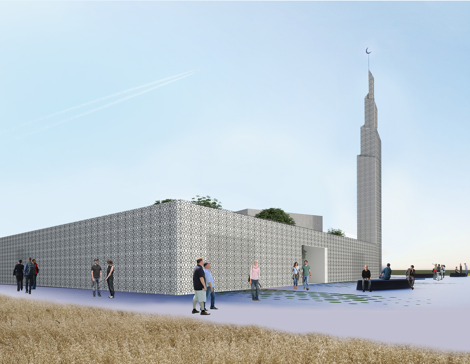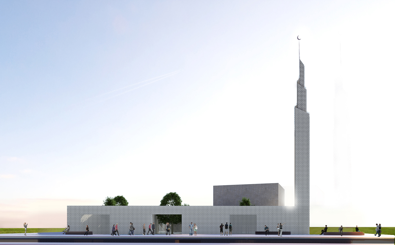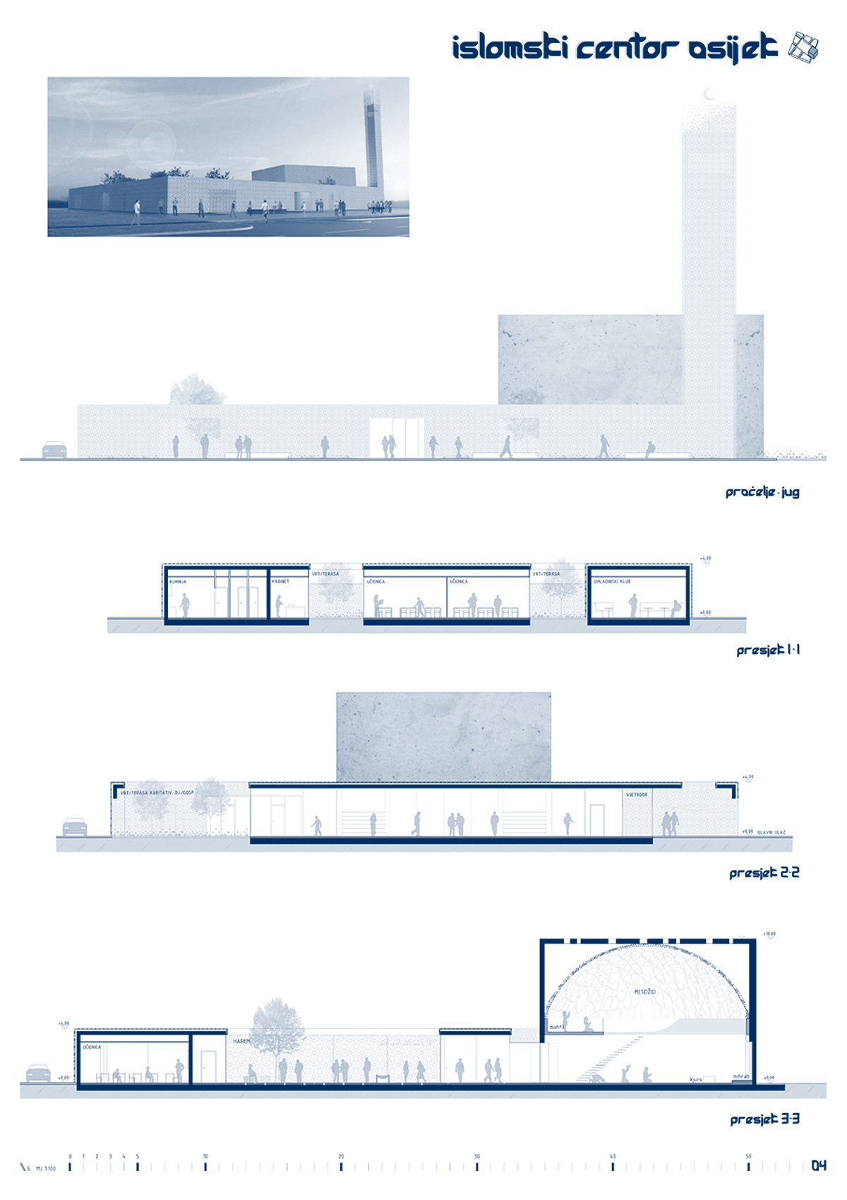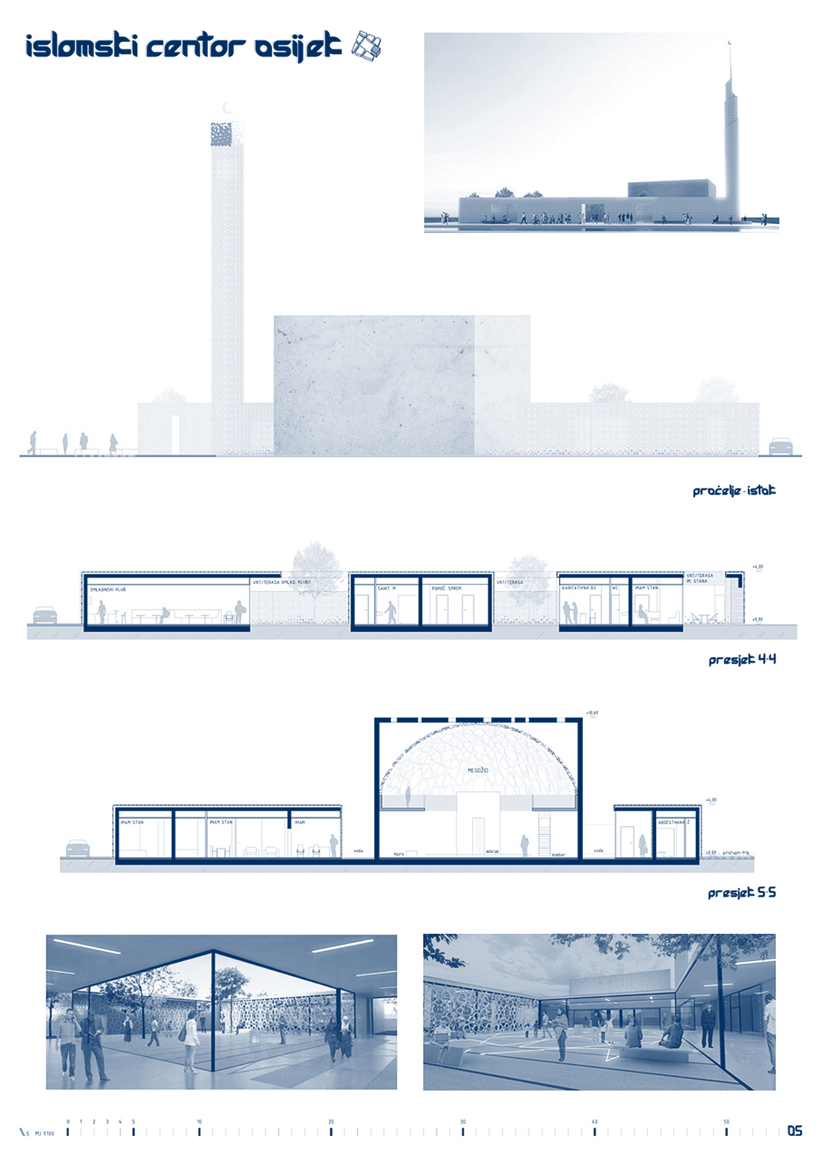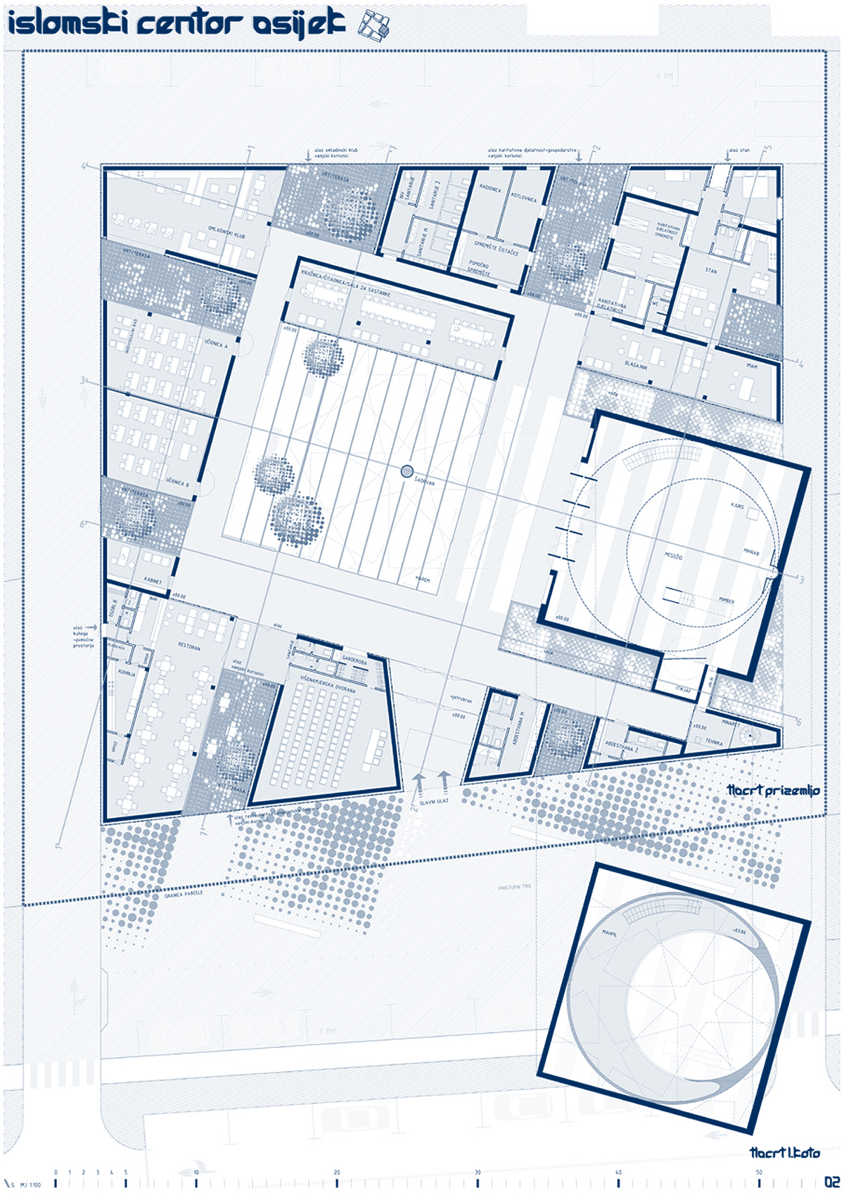 ”Osnovno obilježje i eksplicitni koncept natječajnog rada je rahla matrica onoga što Autor naziva ”gradom u gradu”. Ne radi se o idiosinkratskom imenovanju, nego o referenci na tradiciju arhitektonske tipologije koju je H. Hertzberger nazvao ”kazbahizmom” (još ju se zove ”strukturalizmom”, ”tepih” ili ”mat” arhitekturom), ili riječima Alda van Eycka, u kojoj su ”odnosi među stvarima i unutar stvari važniji nego stvari same”. Praksa koja se najprepoznatljivije očituje u smanjivanju objektnosti zgrade, odnosno raspršivanju, razbijanju volumena u jedinice manje kompaktnosti, na način da plastična forma jednog objekta (kao ”smrznute glazbe”, kao ”igre volumena pod suncem”) gubi na značaju u korist matrice koja povezuje više manjih – samih po sebi besformnih, formalno neutralnih – u urbanu cjelinu. Paradoks: razbijanjem se postiže cjelina. Van Eyckova filozofija: ”Grad je velika kuća, a kuća je mali grad”. Strukturirajući ovu kuću kao mali grad, Autor na kvalitetan način postiže neka od glavnih svojstava traženih projektnim zadatkom: prostornu višeslojnost, strukturiranu umreženost raznorodnih sadržaja, integriranu alternaciju otvorenih i zatvorenih površina, kao i estetsku nepretencioznost u skladu s islamskom etikom skromnosti i duhovnosti. Do jednog od bitnih raslojavanja u povijesti moderne arhitekture došlo je upravo otuda što je Team X (na čelu s van Eyckom i Smithsonima) zahtijevao reviziju principa disocijacije i segregacije kakvu je proizvodio klasični modernizam, prema arhitekturi integriranja, umreživanja, asocijacije. Radi se u krajnjoj konzekvenci o novoj definiciji suštine arhitekture: ona, kažu, ne prebiva u smrznutom akordu pozitivnog volumena, na čije ćemo se skulpturalne estetske kvalitete nezdravo fiksirati (diviti se, sagledavati, pljeskati, fotografirati) nego u prostoru između zidova – negativnom volumenu. Traže se ”primjeri koji sprečavaju izgrađene elemente od dominiranja, u korist prostora između” (Hertzberger). Genijalan zaokret: događanje umjesto sagledavanja! Što treba projektirati: ne formu objekta već formu ljudskog prostornog postojanja koju objekt generira. U epohi obilježenoj kao ”društvo spektakla”, društvo anestetizirane potrošnje senzacija, artikala i imidžâ, s pritiskom neprestanog kreiranja/dizajniranja novih i novih potrošnih formi, između ostaloga simulakrumskih kuća-slikâ, Autor se priklanja stavu po kojem ništa nije primjerenije kao arhitektura kompleksa sakralne provenijencije – po svojoj naravi antagonističke epohi – od tipologije koja negira ekspresivnu plastiku i uopće fiksaciju na volumetriju. Primjenjujući, umjesto produkcije sljedećeg u nizu hirova dizajna, smithsonovski postulat po kojem elementi istog reda ne trebaju izgledati različito bez razloga – nota bene, također prisutan u islamskoj estetici repetitivnosti i multiplikacije. Čak i kupolu i minaret oblikujući usuprot logici ikoničkog spektakla, aplicirajući i na njih elementarni kubusni minimalizam primijenjen na bazi. Upravo taj minaret i kupola (odnosno, jezgra sačinjena od molitvenog prostora i harema, tlocrtno identičnih, volumenski oprečnih) predstavljaju dosljedno provođenje i sljedećeg postulata strukturalističke arhitekture: supostavljanja, po Autoru, ”dva određujuća elementa građevine”: neutralnu strukturu ”grada u gradu” (kao podloge, pravila, kohezijske matrice) obogaćene figuracijama minareta i džamije (kao iznimki, iskoraka, incidencija) – ako i ne ekspresivnošću, naglašujućih ipak samom svojom prostornom i volumenskom markantnošću. …”  OCJENJIVAČKI SUD
