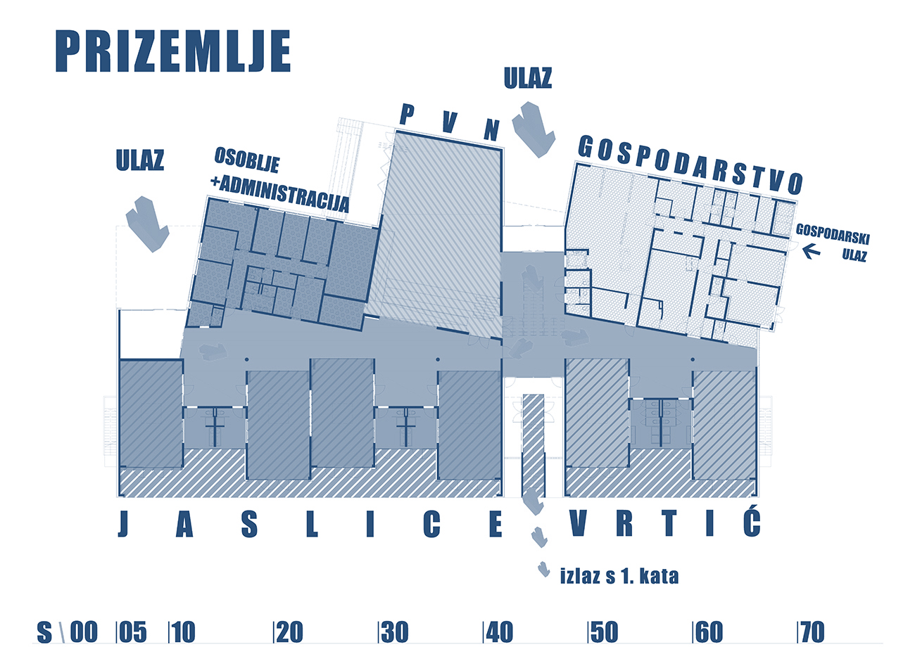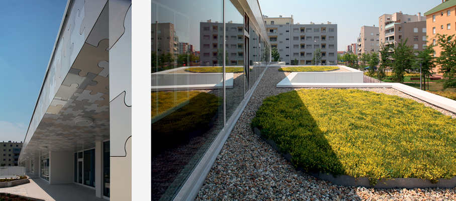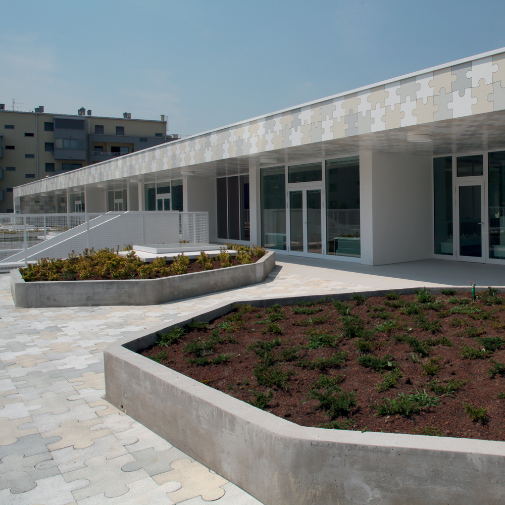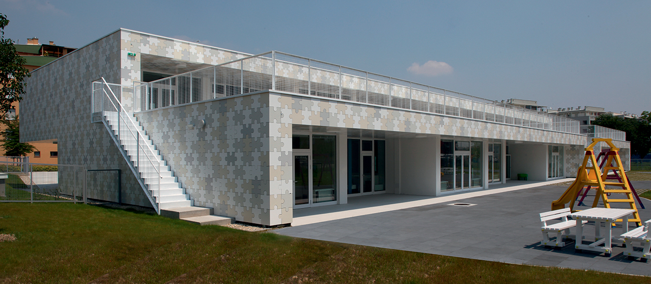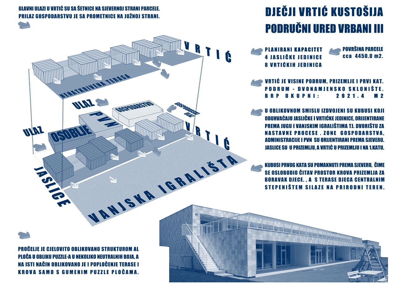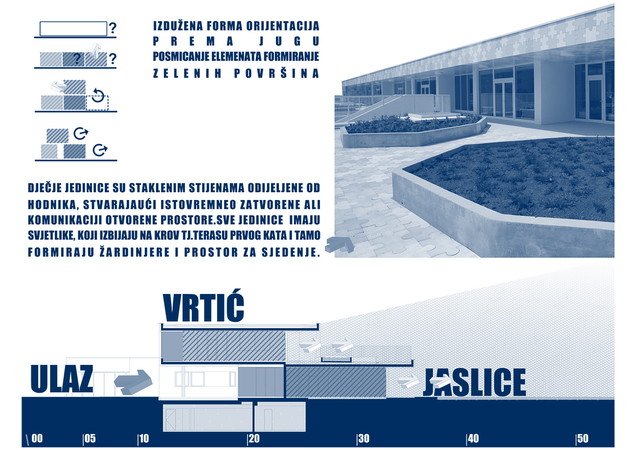 Osnovna koncepcija objekta proizlazi iz zahtjeva lokacije i funkcionalnih potreba. Glavni ulaz u vrtić je sa šetnice na sjevernoj strani parcele, a u jaslice sa zapadne strane, sa prostora parkinga ili sa šetnice. Prilaz gospodarstvu je sa prometnice na južnoj strani. U oblikovnom smislu izdvajamo kubuse koji obuhvaćaju dječije dnevne boravke, orjentirane ka jugu, prema dvorištu za igru i nastavne procese; te kubuse gospodarstva, administracije i sale za više namjena orjentirane prema sjeveru. Objekt je koncipiran kao jedna sažeta izdužena forma koja se otvara prema jugu, kako bi se što više prostora oslobodilo za dječija igrališta. Jaslice su smještene u prizemlju a vrtić na prizemlju i katu. Kako bi se ostvarilo što više slobodnih površina za igru djece, kubus sa gornjim jedinicama je smaknut prema sjeveru, iznad gospodarstva, pvn-a i administracije, čime se oslobodio čitav prostor krova za boravak djece. S terase djeca centralnim stepeništem silaze na prirodni teren. Dječje jedinice su staklenim stijenama odijeljene od hodnika, stvarajaući istovremneo zatvorene ali komunikaciji otvorene prostore. Jedinice u prizemlju imaju svjetlike, koji izbijaju na terasu prvog kata i tamo formiraju žardinjere i prostor za sjedenje. Interieursko oblikovanje je prilagođeno uzrastu korisnika- žive boje podova i zidova, stvaraju poticajno i vedro okruženje za svakodenvni boravak. Pročelje je cjelovito oblikovano strukturom Al ploča u obliku puzzle-a u nekoliko neutralnih boja, a na isti način oblikovano je i popločenje terase i krova samo s gumenim puzzle pločama. Vrtić tako postaje svijetla ali i razigrana forma , smirenih tonaliteta, blage dinamike, ” osvježenje” u naselju već viđenog.