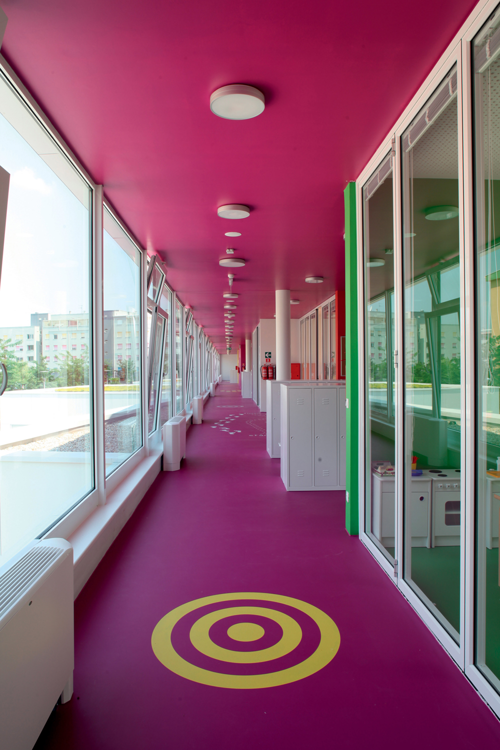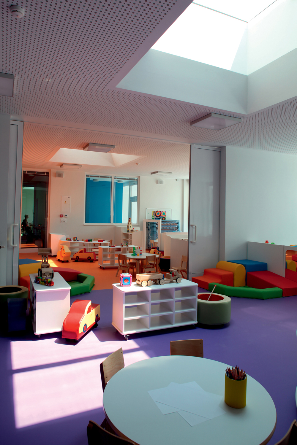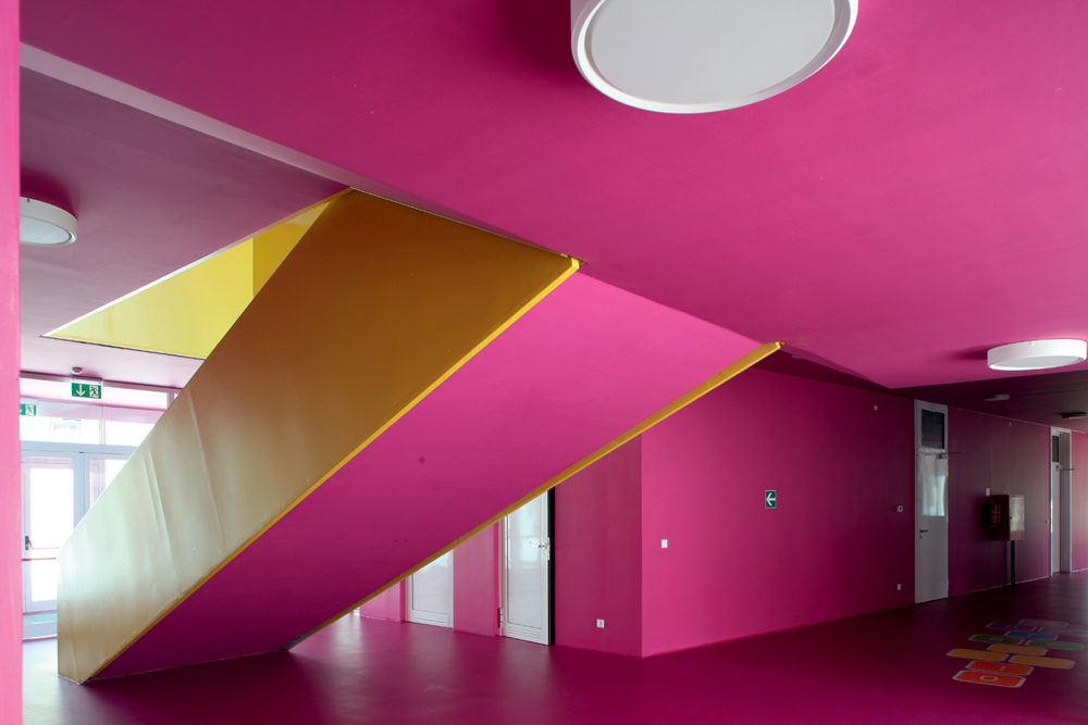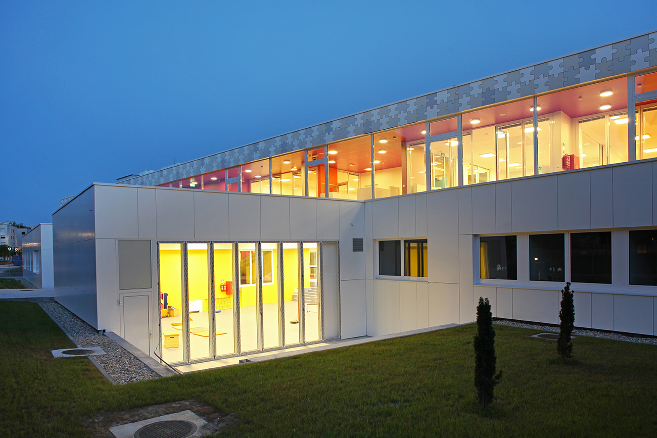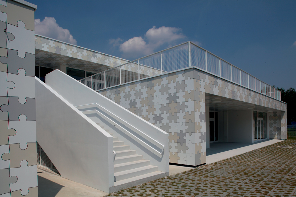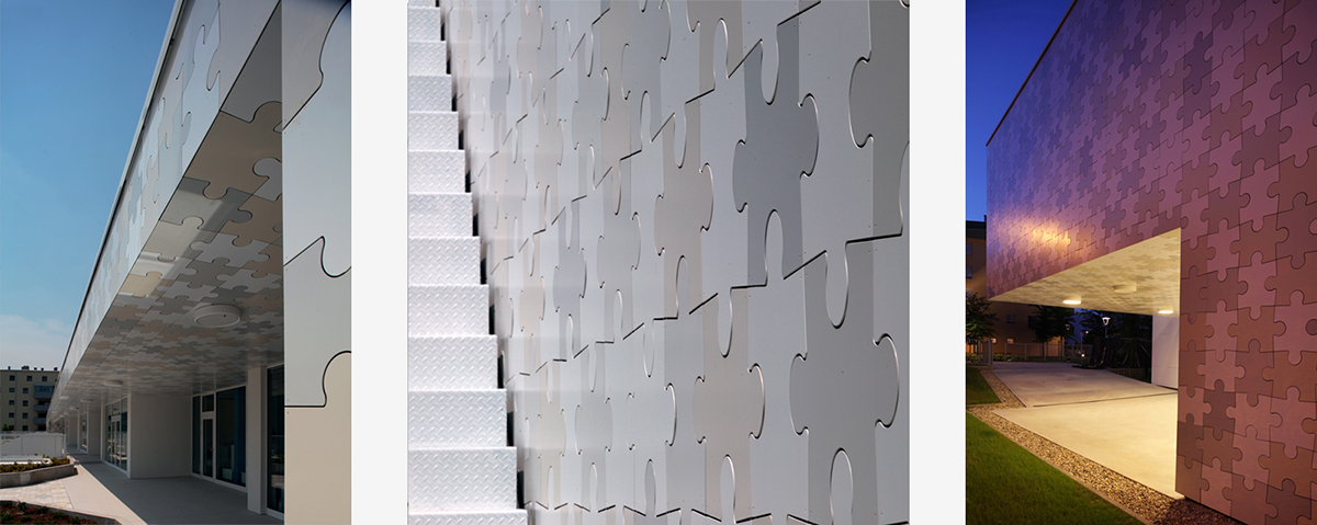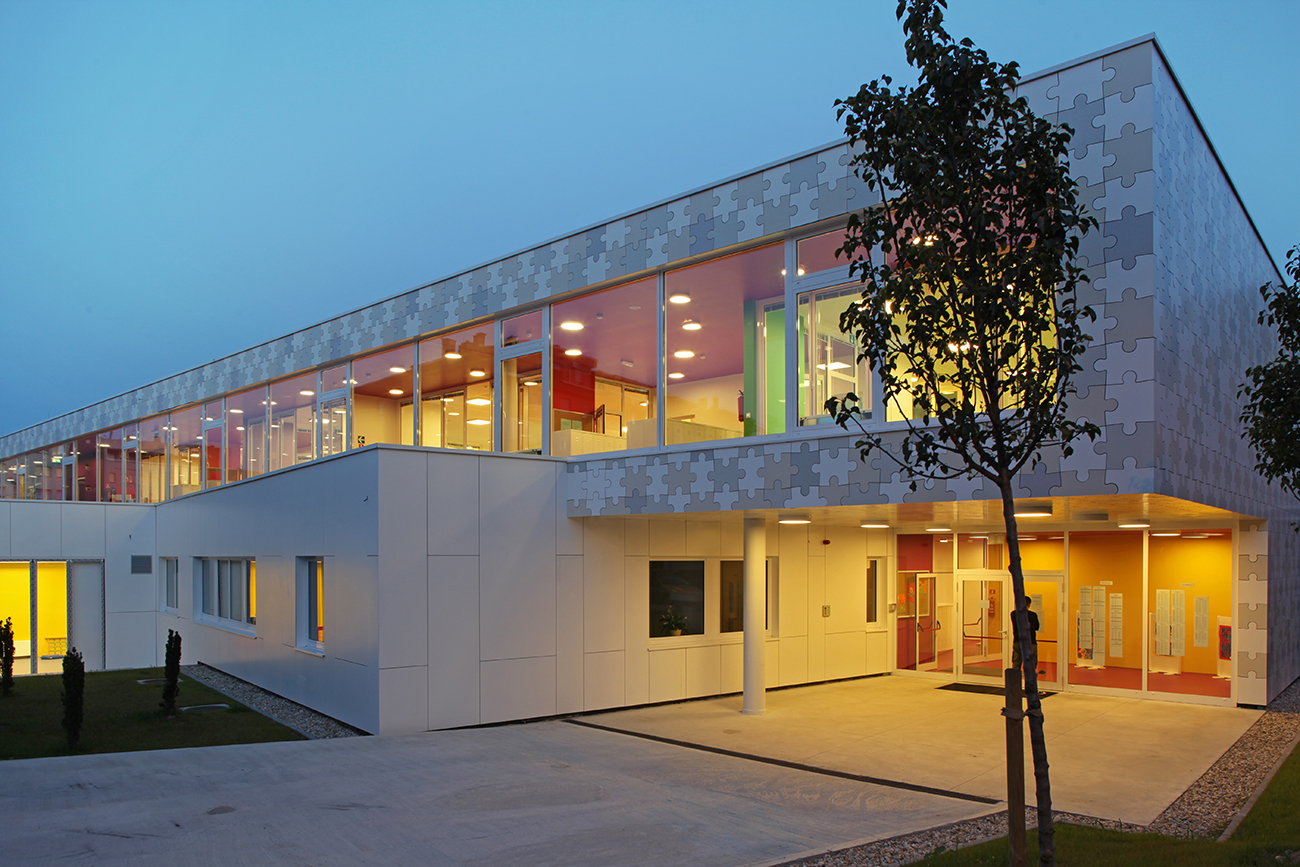 Osnovna koncepcija objekta proizlazi iz zahtjeva lokacije i funkcionalnih potreba. Glavni ulaz u vrtić je sa šetnice na sjevernoj strani parcele, a u jaslice sa zapadne strane, sa prostora parkinga ili sa šetnice. Prilaz gospodarstvu je sa prometnice na južnoj strani. U oblikovnom smislu izdvajamo kubuse koji obuhvaćaju dječije dnevne boravke, orjentirane ka jugu, prema dvorištu za igru i nastavne procese; te kubuse gospodarstva, administracije i sale za više namjena orjentirane prema sjeveru. Objekt je koncipiran kao jedna sažeta izdužena forma koja se otvara prema jugu, kako bi se što više prostora oslobodilo za dječija igrališta. Jaslice su smještene u prizemlju a vrtić na prizemlju i katu. Kako bi se ostvarilo što više slobodnih površina za igru djece, kubus sa gornjim jedinicama je smaknut prema sjeveru, iznad gospodarstva, pvn-a i administracije, čime se oslobodio čitav prostor krova za boravak djece. S terase djeca centralnim stepeništem silaze na prirodni teren. Dječje jedinice su staklenim stijenama odijeljene od hodnika, stvarajaući istovremneo zatvorene ali komunikaciji otvorene prostore. Jedinice u prizemlju imaju svjetlike, koji izbijaju na terasu prvog kata i tamo formiraju žardinjere i prostor za sjedenje. Interieursko oblikovanje je prilagođeno uzrastu korisnika- žive boje podova i zidova, stvaraju poticajno i vedro okruženje za svakodenvni boravak. Pročelje je cjelovito oblikovano strukturom Al ploča u obliku puzzle-a u nekoliko neutralnih boja, a na isti način oblikovano je i popločenje terase i krova samo s gumenim puzzle pločama. Vrtić tako postaje svijetla ali i razigrana forma , smirenih tonaliteta, blage dinamike, ” osvježenje” u naselju već viđenog.